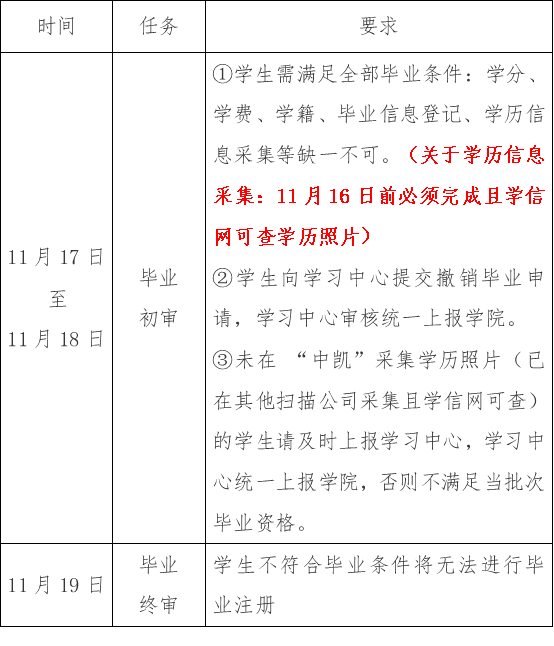 请各远程学习中心、函授站相关老师一定严格按照通知要求所规定的时间完成相关工作,11月19日完成毕业终审,学院将根据毕业终审名单注册学生电子学历并制作毕业证书,如有学分、学费、学籍、毕业信息登记、学历信息采集或学信网身份核验未通过其中之一的问题,则不符合毕业要求,学生将无法进行毕业注册。
