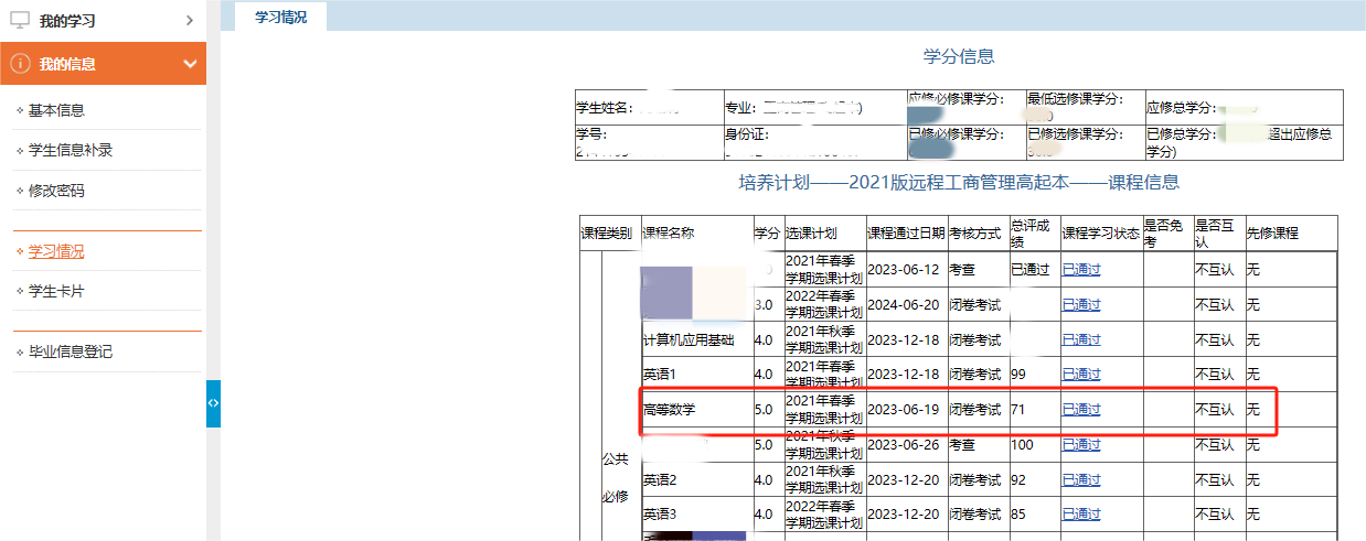 申请免考原因选择“已通过应报考科目上一级别统考且成绩合格”;上传免考资料:进入“我的信息-学习情况”截图,截图页面须包含学生本人信息及申请免考科目的互认课程成绩,示例如下: