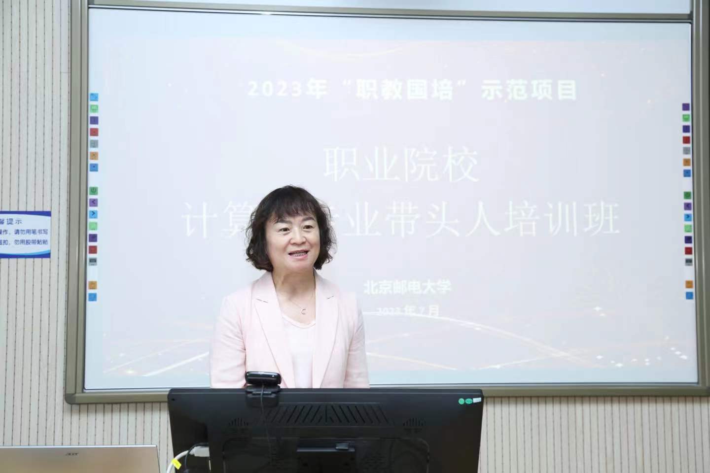 7月20日上午,教育部2023年“职教国培”示范项目高职院校计算机类专业带头人培训班在北京邮电大学教三楼117举行开班仪式。开班仪式由北京邮电大学网络(继续)教育学院副院长刘莹主持,北京邮电大学网络(继续)教育学院党委书记张茹、北京邮电大学网络(继续)教育学院院长张闯、深信服产教中心校企合作华北区总监邢雷、北京大学教育学院教授郭建如出席,来自全国25个省市自治区、53所高职院校的53名学员参加,为期20天的培训拉开序幕。